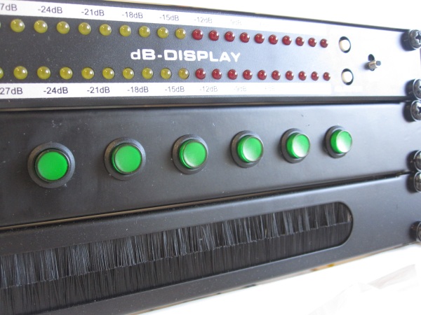 In my studio console are the blue CCFL lights, the rack lights and the gooseneck lights on top. They will all draw current from a separated computer power supply. But in order to switch things on and off I still needed a switch panel just for that. So I found these beautiful switches with build in LED lights and planned on putting them in a single unit height blanking panel.